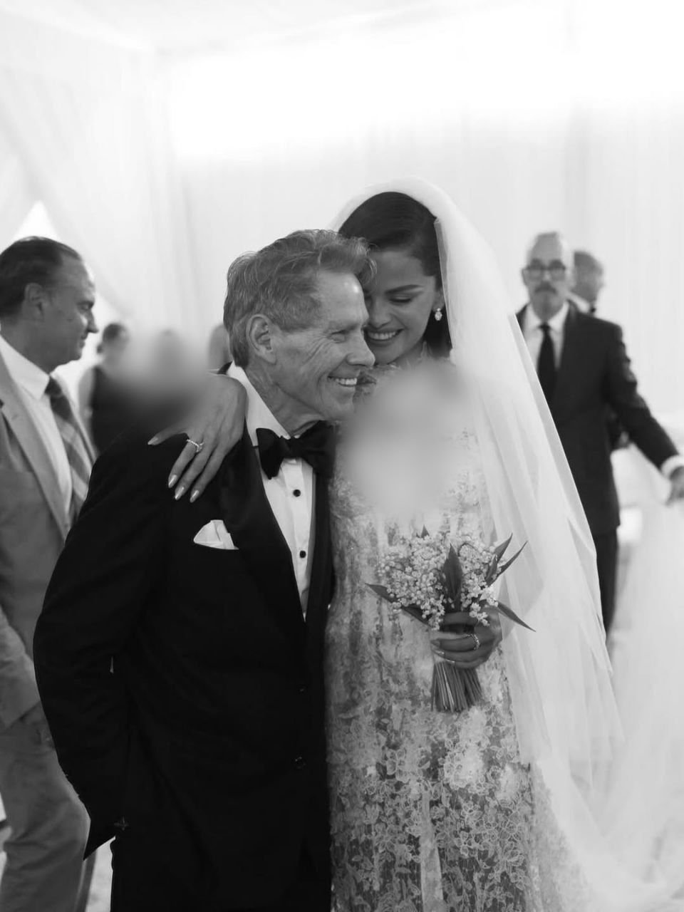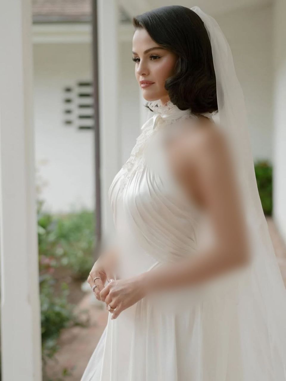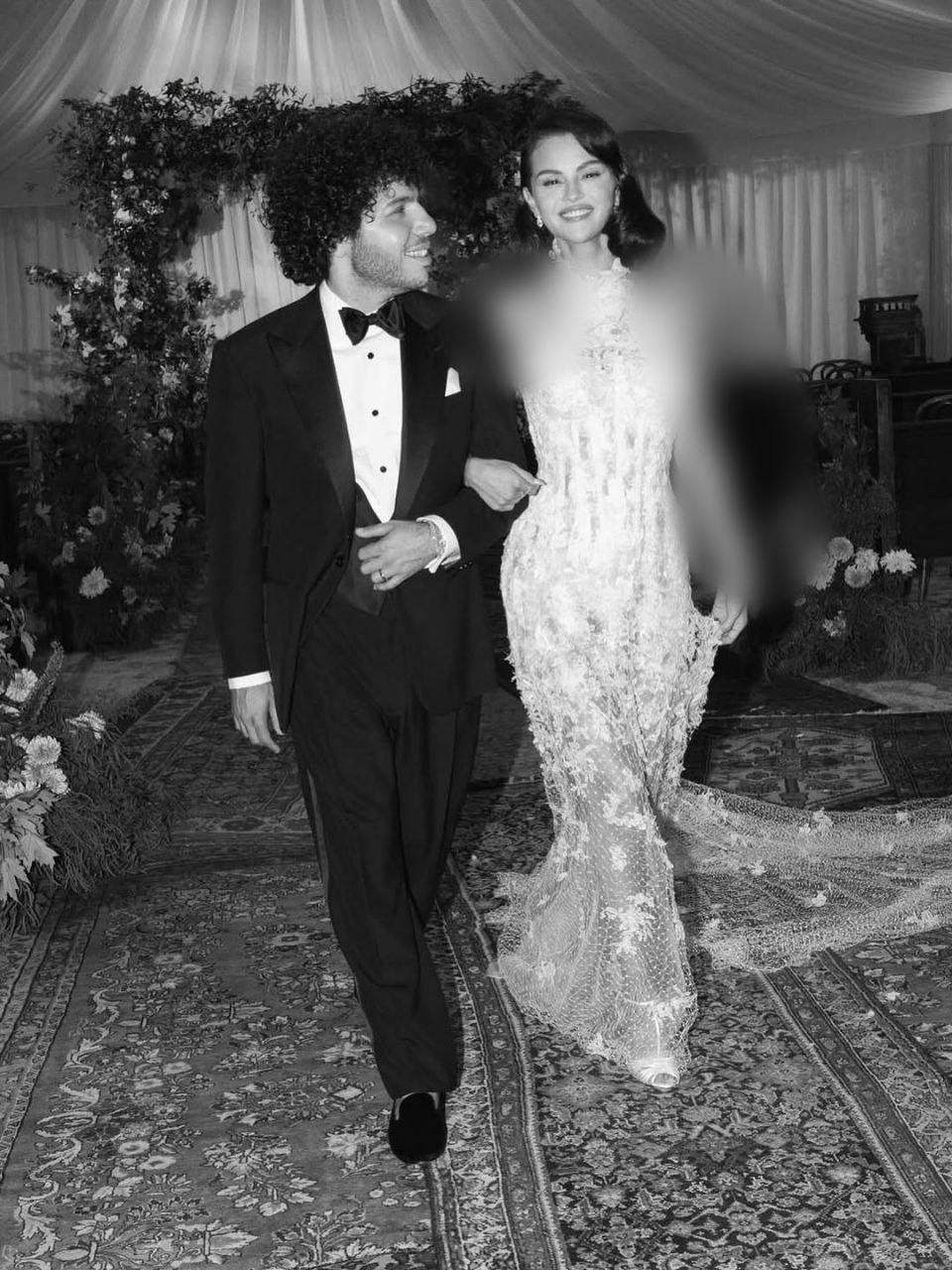 در عکسها، سلنا با لباسی کلاسیک و ساده اما خیرهکننده دیده میشود، در حالی که بنی بلانکو با لبخندی آرام در کنار او ایستاده است. فضای مراسم با گلآرایی لطیف، نورپردازی گرم و حضور دوستان نزدیک و چهرههای مشهور دنیای موسیقی و سینما، حالوهوایی صمیمی و عاشقانه داشت.