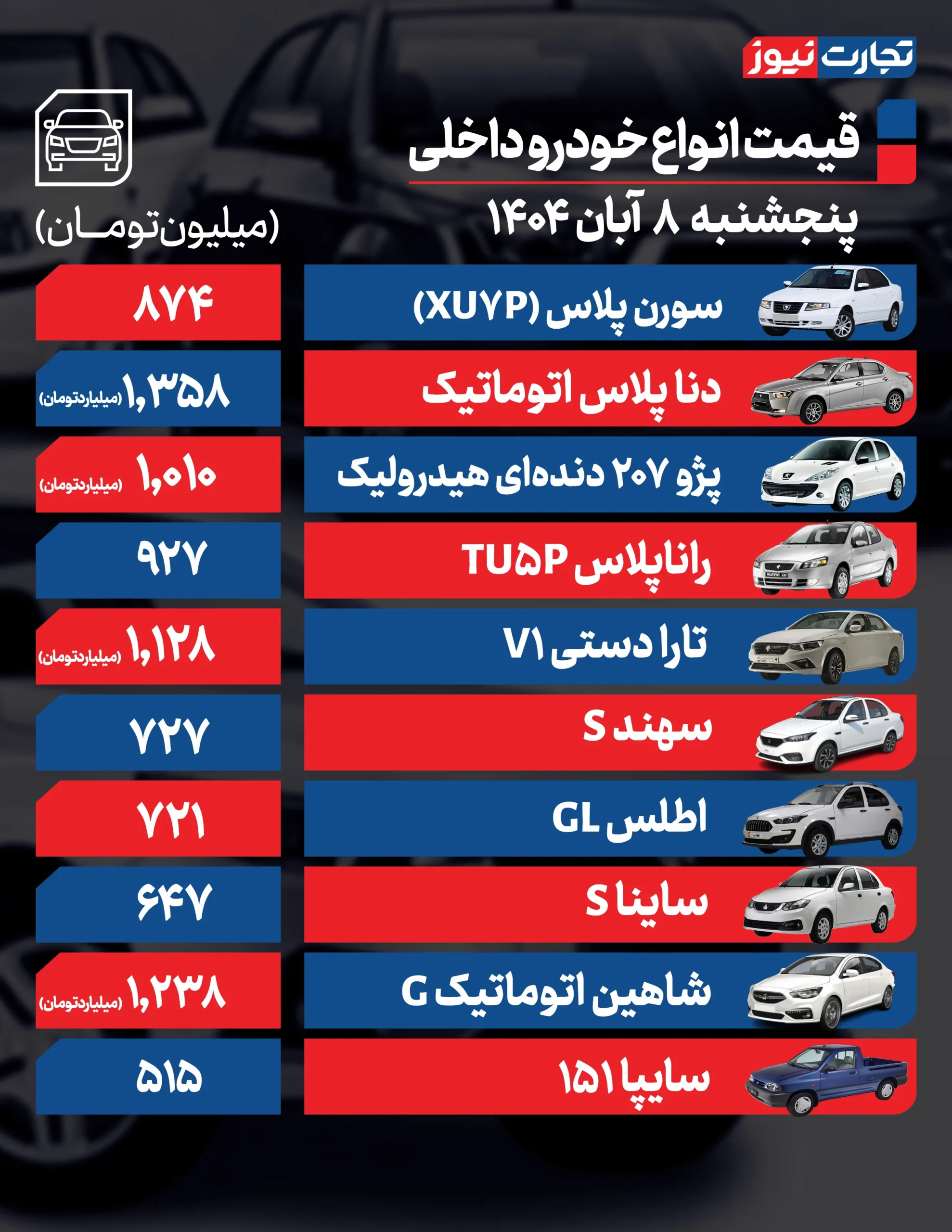 قیمت خودرو امروز 8 آبان 1404 از سوی بنگاههای معاملاتی اعلام شد.