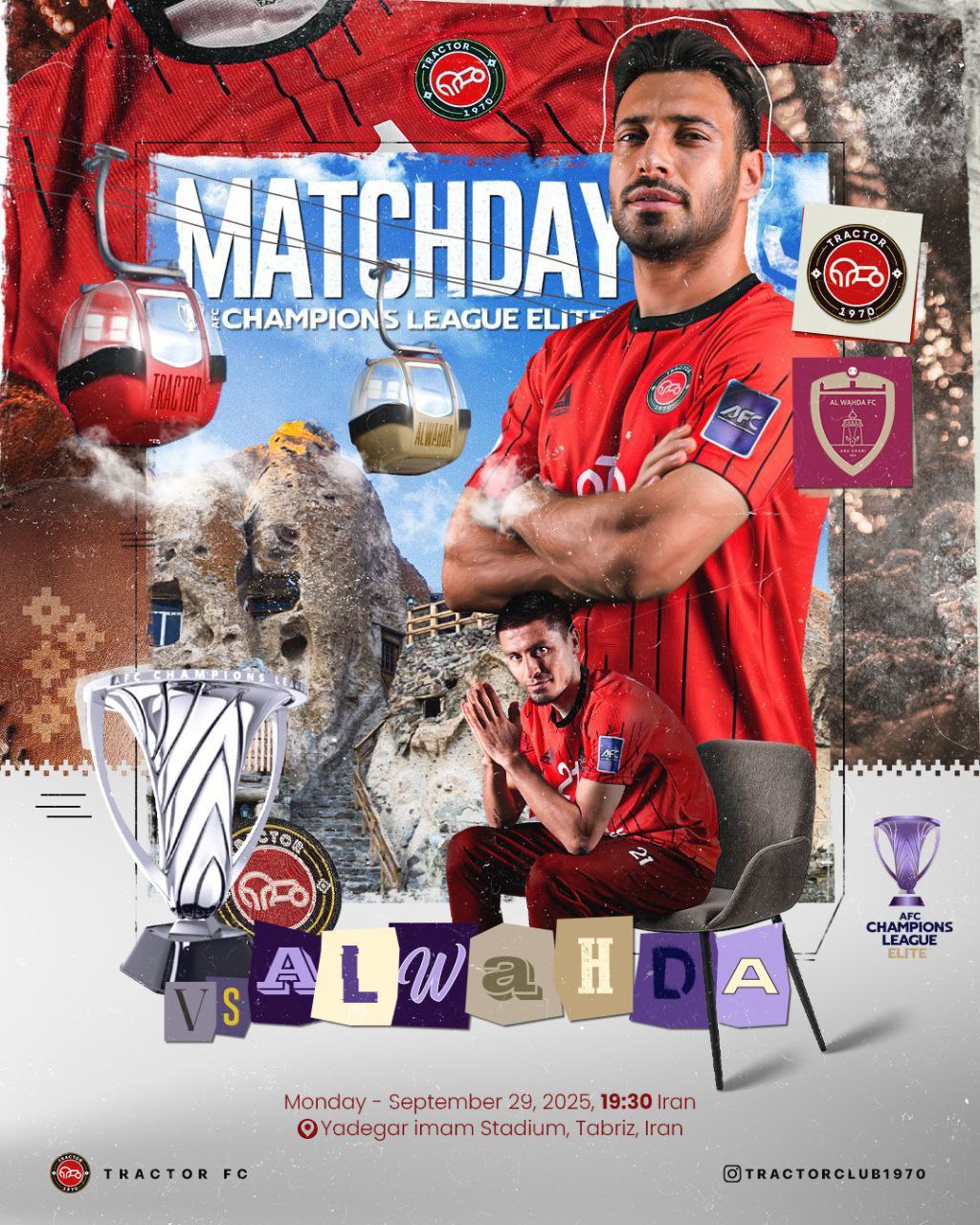 باشگاه تراکتور با انتشار پوستر رسمی دیدار حساس مقابل الوحده امارات، هواداران را به حمایت پرشور در ساعت ۱۹:۳۰ امروز فراخواند. این مسابقه در چارچوب رقابتهای آسیایی برگزار میشود.